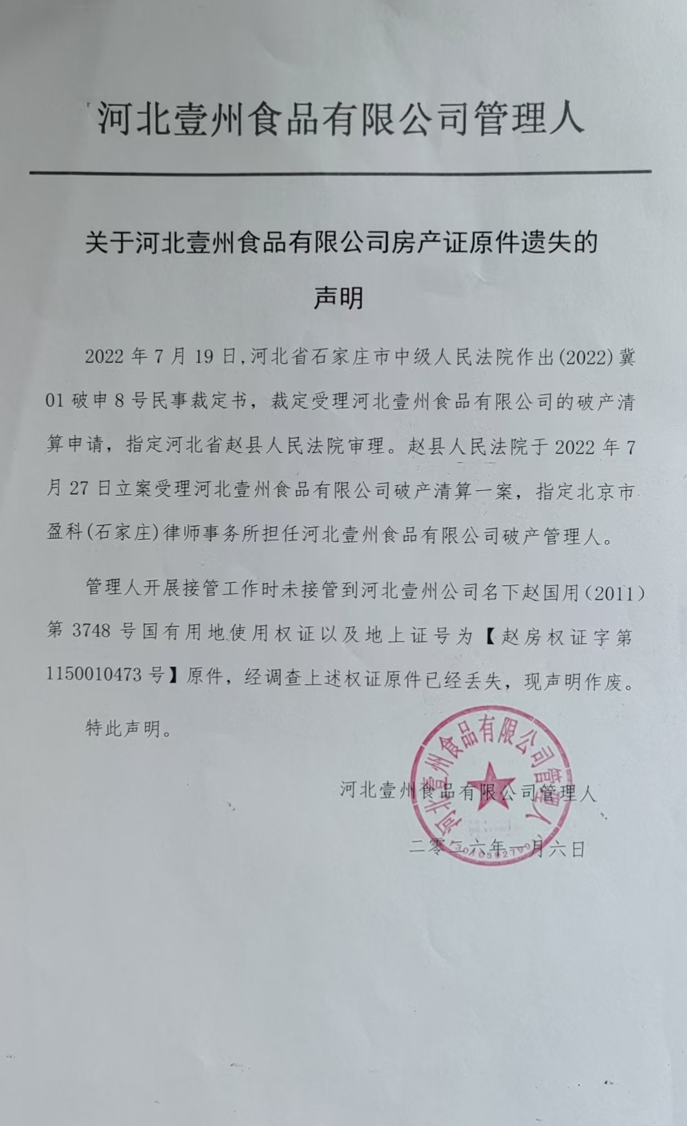 关于河北壹州食品有限公司房产证原件遗失的声明