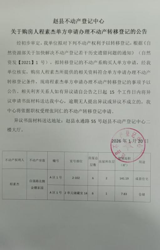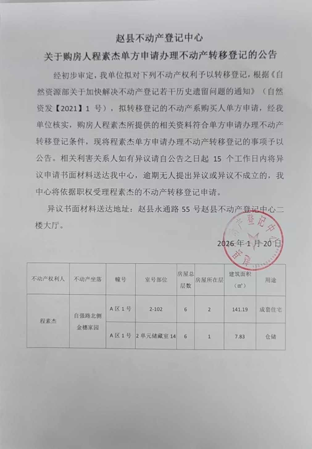 关于购房人程素杰单方申请办理不动产转移登记的公告
